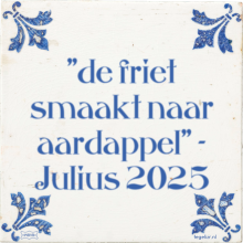 De friet smaakt naar aardappel 15 keer bekeken Hoeveel sterren is dit tegeltje waard? 54321 geef sterren Leuk? Of kun jij het beter? Maak je eigen tegeltje. Jouw tekst: Alleen letters, cijfers en leestekens. Maximale lengte 90 tekens bak mijn tegeltje Recente tegeltjes 1 tot 12 "de friet smaakt naar aardappel" - Julius 2025Drank lost je problemen niet op, maar thee en pepernoten ook nietLiefde is blind, het huwelijk opent je ogenIk kan alles weerstaan behalve verleidingWaarom moeilijk doen als chillen ook nergens toe leidtEr is geen weg naar geluk, geluk is de weg naar het levenDe eerste vijf dagen na het weekend zijn het zwaarst om te doorstaanWees niet boos op luie mensen, ze hebben immers niks gedaanAls je het glas steeds aanvult is het nooit half leeg, of half volEén glas wijn is voor de gezondheid, de rest van de fles is voor de lolik ben dol op jouLoopt alvolgende 12 tegels›Bovenkant Bak een tegeltje! Bak een tegeltje! Jouw tekst: Alleen letters, cijfers en leestekens. Maximale lengte 90 tekens bak mijn tegeltje ×